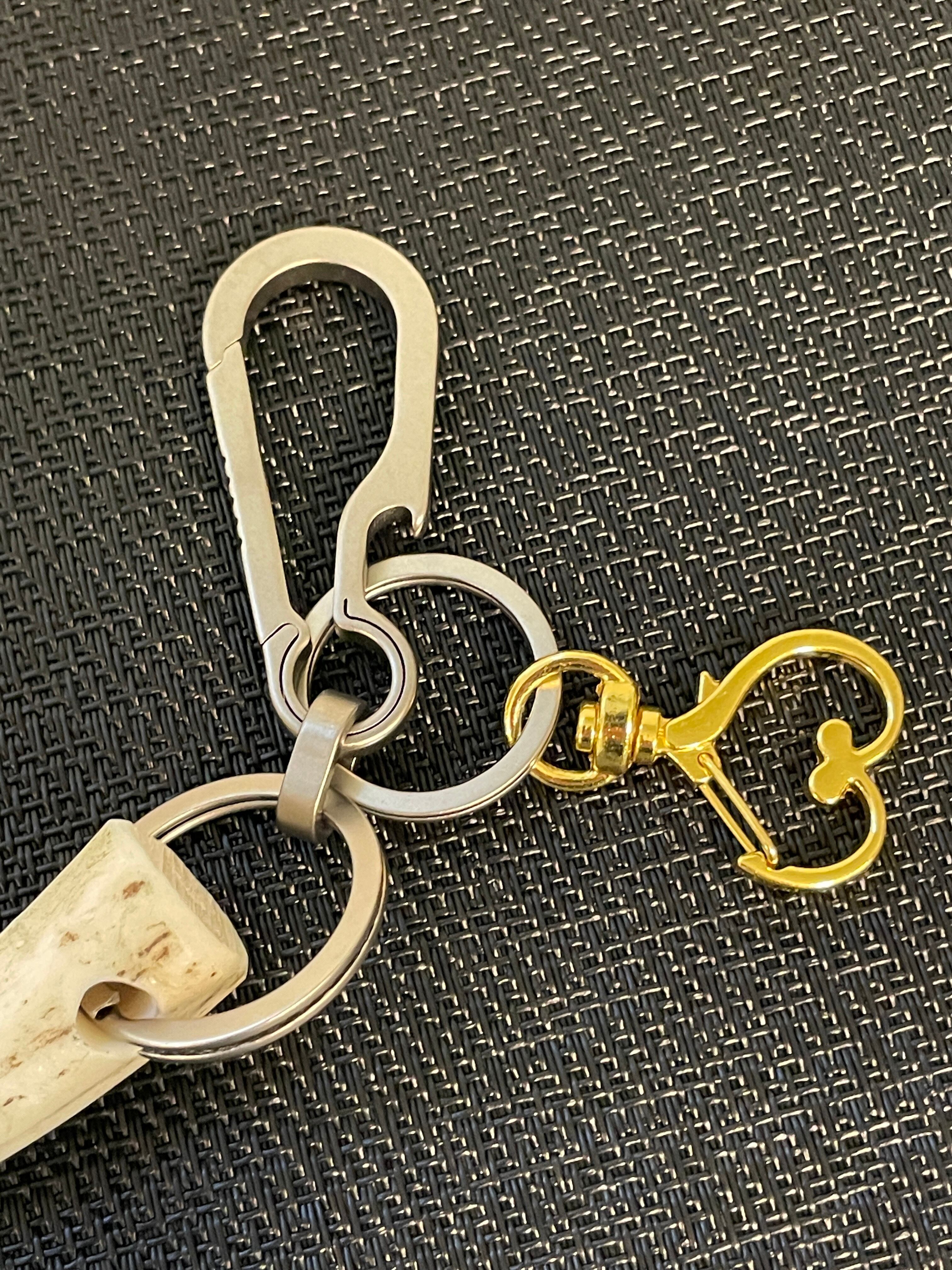 金具はチタン製でカラビナ部分が栓抜き形状になっています。